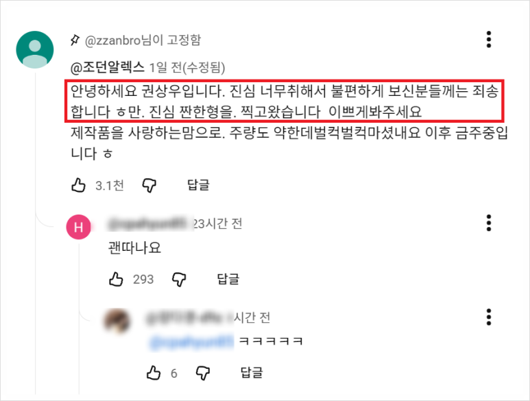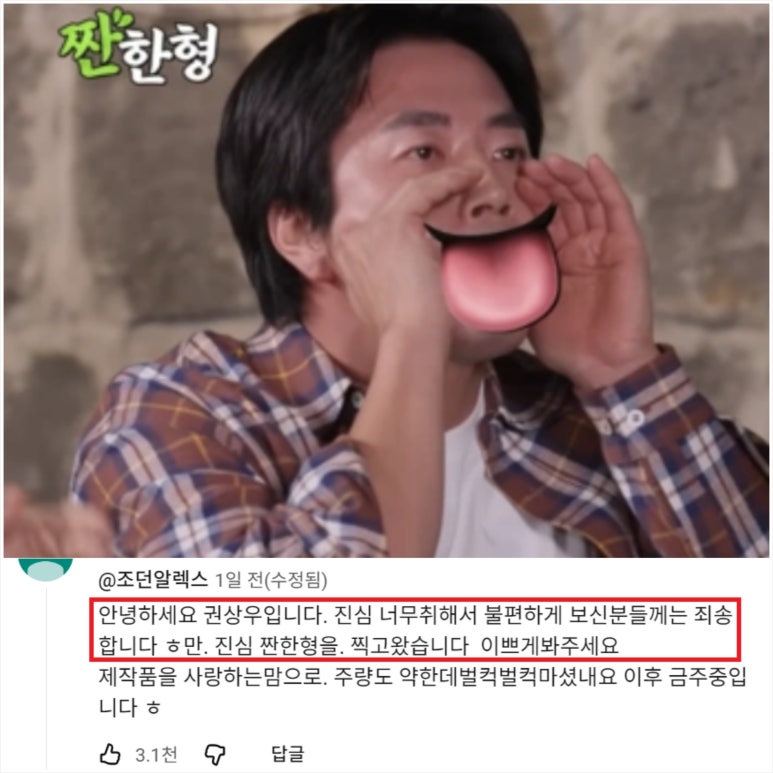짧지만, 변명 없는 사과를 했고, ‘짠한형’ 측은 이 댓글을 상단에 고정했다.